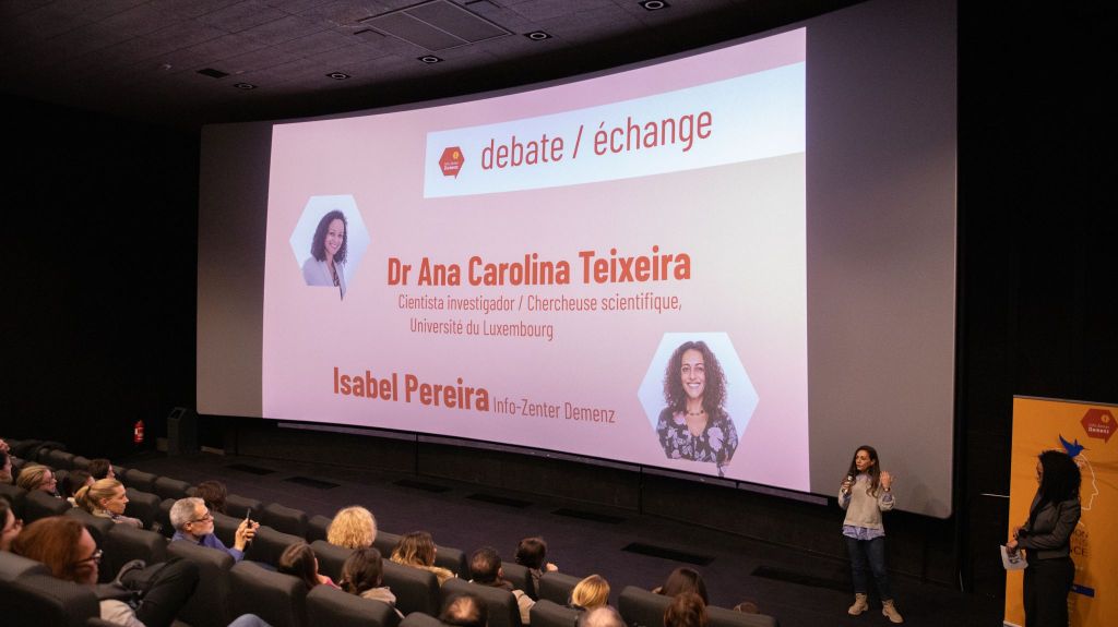 On February 13th and 27th, Info-Zenter Demenz had the pleasure of welcoming over 200 people for the screenings of the Portuguese film “MÃE” at Ciné Le Paris in Bettembourg and Ciné UTOPIA in Luxembourg City. The film tells the story of “two siblings who care for their mother, who suffers from Alzheimer’s, a reality experienced by many families” and “explores the role of the informal caregiver as they cope with the various situations in their daily lives.” Dr. Ana Carolina Teixeira Santos (University of Luxembourg) and Isabel Pereira (Info-Zenter Demenz) moderated a discussion about dementia and its impact on caregivers, during which several people shared their personal experiences with the disease. João Brás and Diogo Teotónio, the producer and director, traveled from Madeira (Portugal) to attend the March 27th session and talk about their project, how the idea came about, and the challenges faced during the film’s production.
