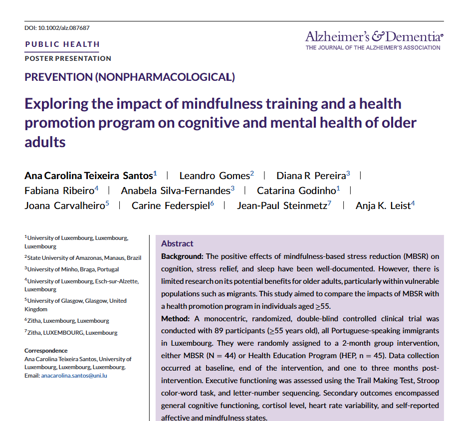 Neste estudo, comparamos intervenções em grupo (um programa de 8 semanas baseado em Mindfulness versus um programa de Promoção da Saúde) entre imigrantes idosos de língua portuguesa no Luxemburgo. Ambas as intervenções mostraram-se viáveis e levaram a melhorias no funcionamento executivo, no stress percebido e na ansiedade. Os benefícios mantiveram-se até 3 meses após o término do programa.