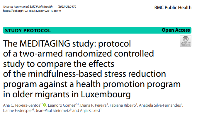 The MEDITAGING study: protocol of a two-armed randomized controlled study to compare the effects of the mindfulness-based stress reduction program against a health promotion program in older migrants in Luxembourg / O estudo MEDITAGING: protocolo de um estudo randomizado controlado de dois braços para comparar os efeitos do programa de redução de stress baseado em mindfulness com um programa de promoção de saúde em migrantes idosos no Luxemburgo. Ana C. Teixeira‑Santos, Leandro Gomes, Diana R. Pereira, Fabiana Ribeiro, Anabela Silva‑Fernandes, Carine Federspiel, Jean‑Paul Steinmetz and Anja K. Leist