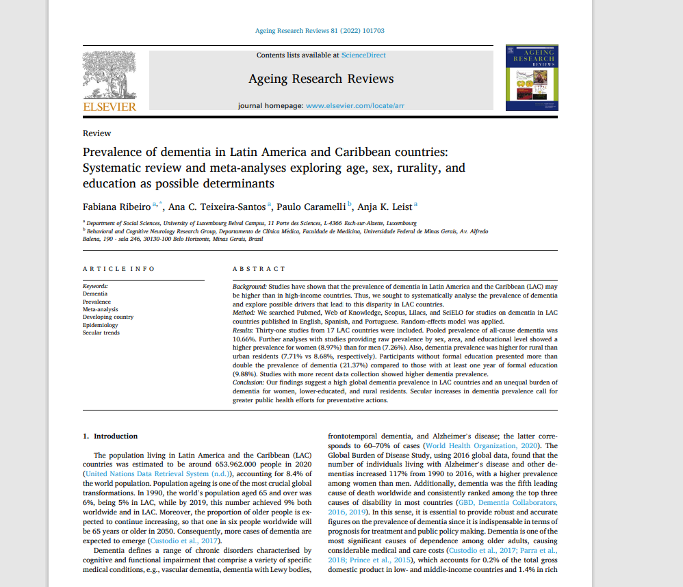 Prevalence of dementia in Latin America and Caribbean countries: Systematic review and meta-analyses exploring age, sex, rurality, and education as possible determinants / Prevalência de demência na América Latina e nos países do Caribe: Revisão sistemática e meta-análises explorando idade, sexo, ruralidade e educação como possíveis determinantes. Fabiana Ribeiro, Ana C. Teixeira‑Santos, Paulo Caramelli and Anja K. Leist