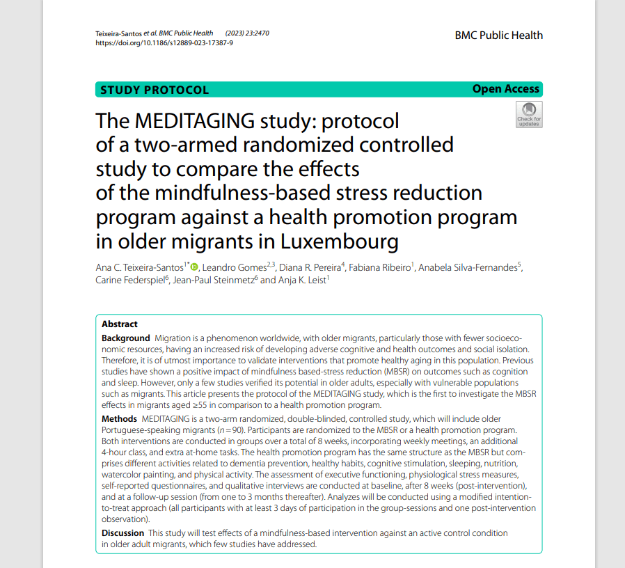 The meditaging study: protocol of a two-armed randomized controlled study to compare the effects of the mindfulness-based stress reduction program against a health promotion program in older migrants in Luxembourg / o estudo meditaging: protocolo de um estudo randomizado controlado de dois braços para comparar os efeitos do programa de redução de stress baseado em mindfulness com um programa de promoção de saúde em migrantes idosos no luxemburgo.Ana C. Teixeira‑Santos, Leandro Gomes, Diana R. Pereira, Fabiana Ribeiro, Anabela Silva‑Fernandes, Carine Federspiel, Jean‑Paul Steinmetz and Anja K. Leist