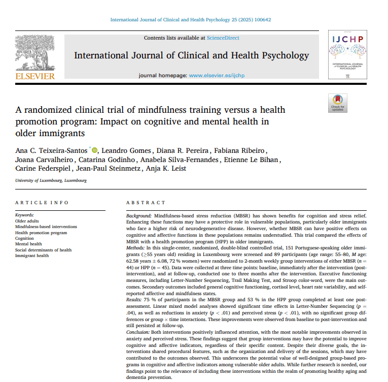 Principais Conclusões: Neste estudo, comparamos intervenções em grupo (um programa de 8 semanas baseado em Mindfulness versus um programa de Promoção da Saúde) entre imigrantes idosos de língua portuguesa no Luxemburgo. Ambas as intervenções mostraram-se viáveis e levaram a melhorias no funcionamento executivo, no estresse percebido e na ansiedade. Os benefícios mantiveram-se até 3 meses após o término do programa.